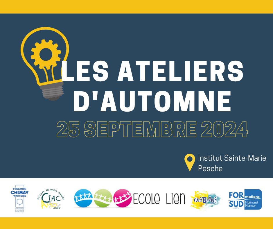 Les Ateliers d’Automne ont pour but de réunir les intervenants sociaux et le monde de l’école (du sud Hainaut) autour d’une demi journée de formation organisée par la Fondation Chimay-Wartoise, FORSUD et Ecole Lien.